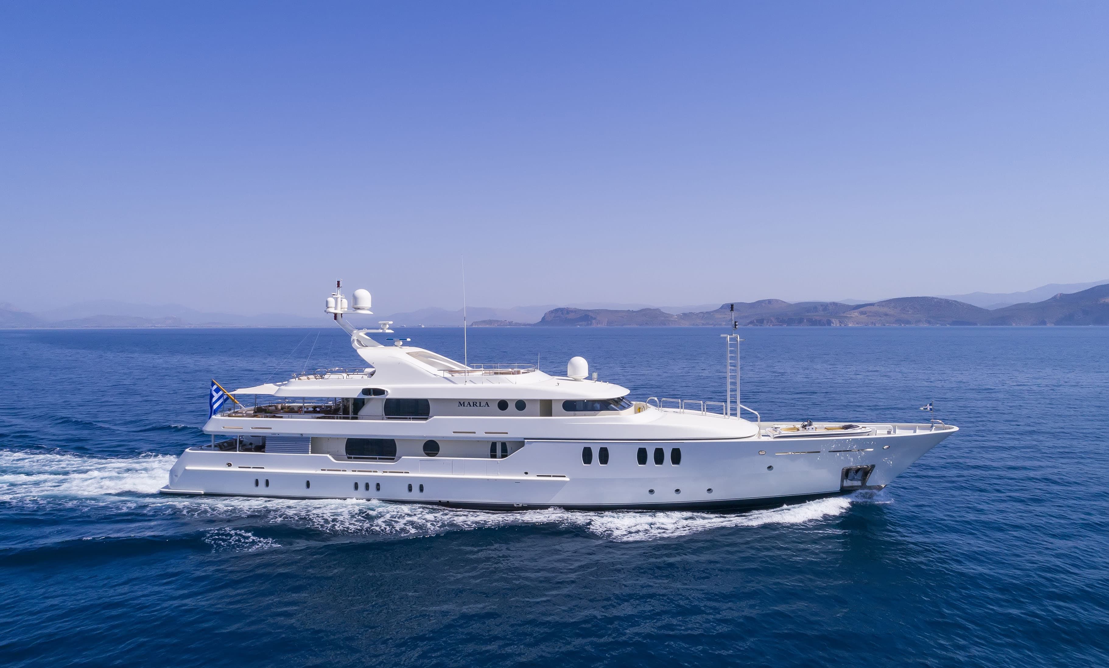 The 50m/164'1" motor yacht 'Marla' (ex. TJ Esperanza) by the Dutch shipyard Amels offers flexible accommodation for up to 12 guests in 6 cabins and features interior styling by English designer Terence Disdale.